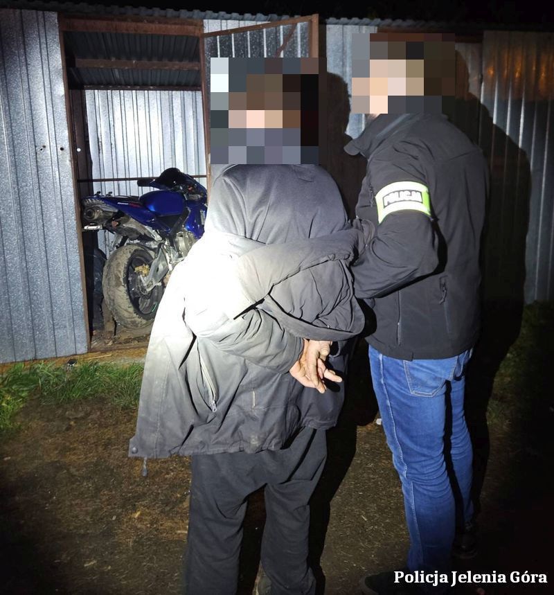 Funkcjonariusze z Wydziału Kryminalnego Komisariatu I Policji w Jeleniej Górze zatrzymali 23-letniego mieszkańca miasta podejrzanego o kradzież motocykla zaparkowanego pod jednym z budynków mieszkalnych. Do zdarzenia doszło 7 listopada rano. Właściciel zauważył brak pojazdu i poinformował policję, wartość maszyny oszacowano na około 13 tysięcy złotych.